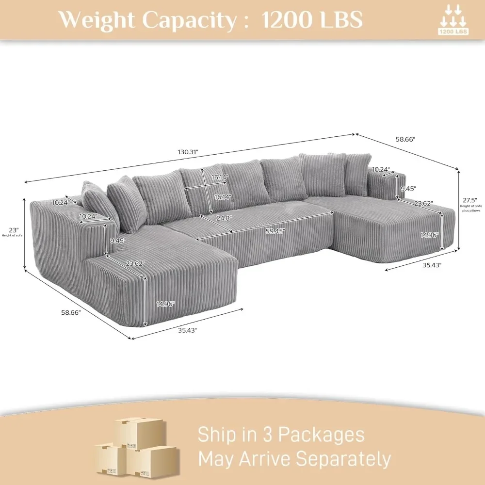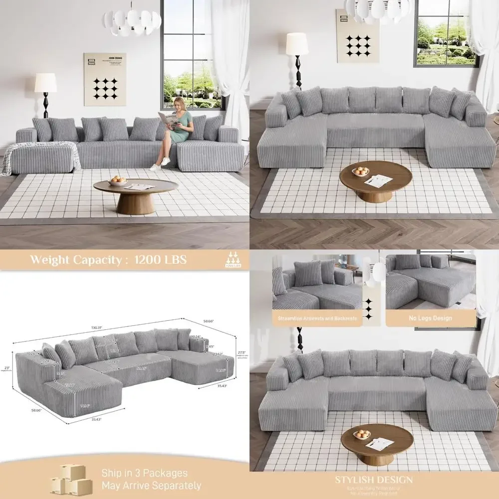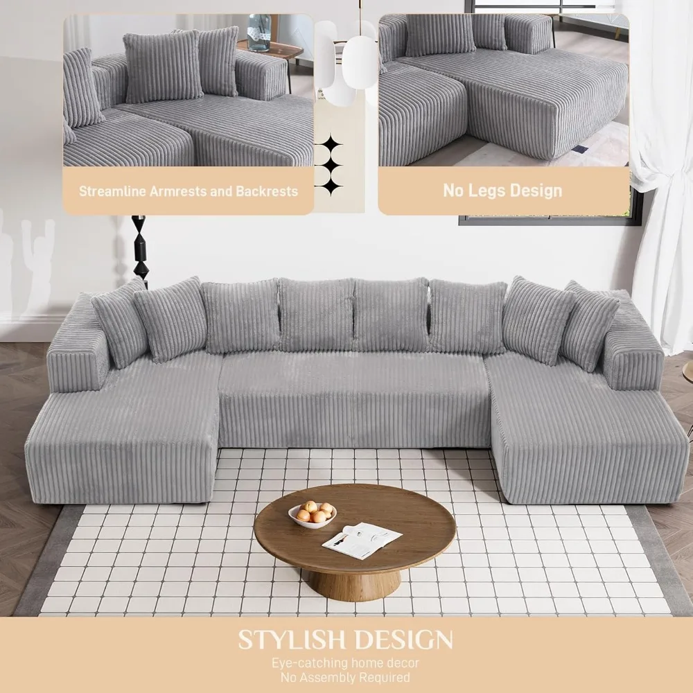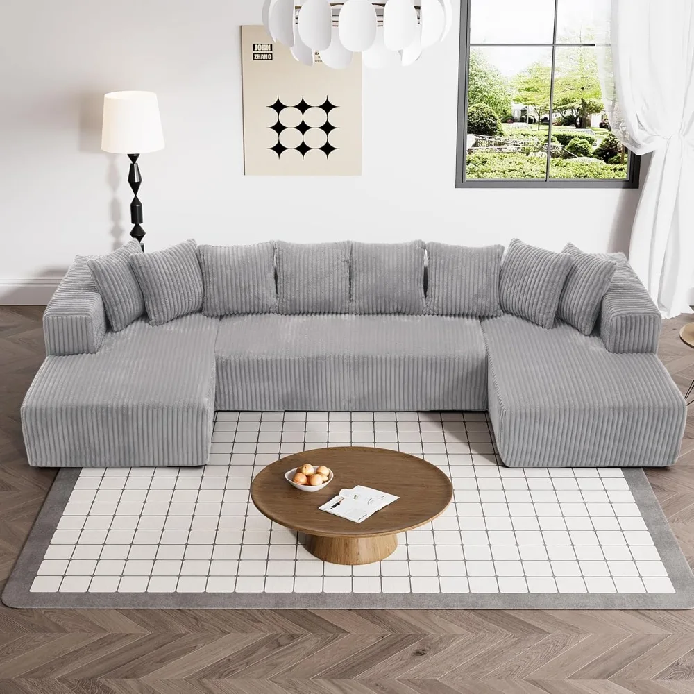 This item features a Double Chaise Lounge Sofa, designed with family warmth in mind to create a cozy and inviting atmosphere. It comfortably seats up to six people with a generous seating area, and the spacious 48.4" double chaise lounge provides ample room for stretching out and relaxing. The Luxury Corduroy Couch Sectional adds sophistication to your space with its U-shape design, clean lines, and sumptuous corduroy upholstery. This timeless piece enhances living rooms, apartments, and bedrooms with its elegant silhouette and versatile U-shape configuration, offering both style and exceptional comfort. The Versatile Modular Cloud Couch is more than just a U-shaped couch sectional; its design adapts to your space, allowing you to arrange the chaise and main sofa together or separately. It boasts clean lines, plush comfort, and a timeless style that meets customizable functionality. Experience unmatched comfort with our meticulously designed oversized sectional sofa, which offers expansive cloud-like seating. The sofa features a supportive high-resilience sponge structure and spring pack for an optimal seating experience. Plush pillows and wide armrests allow this cloud sofa sectional to mold to your preferred lounging position, providing heavenly relaxation.