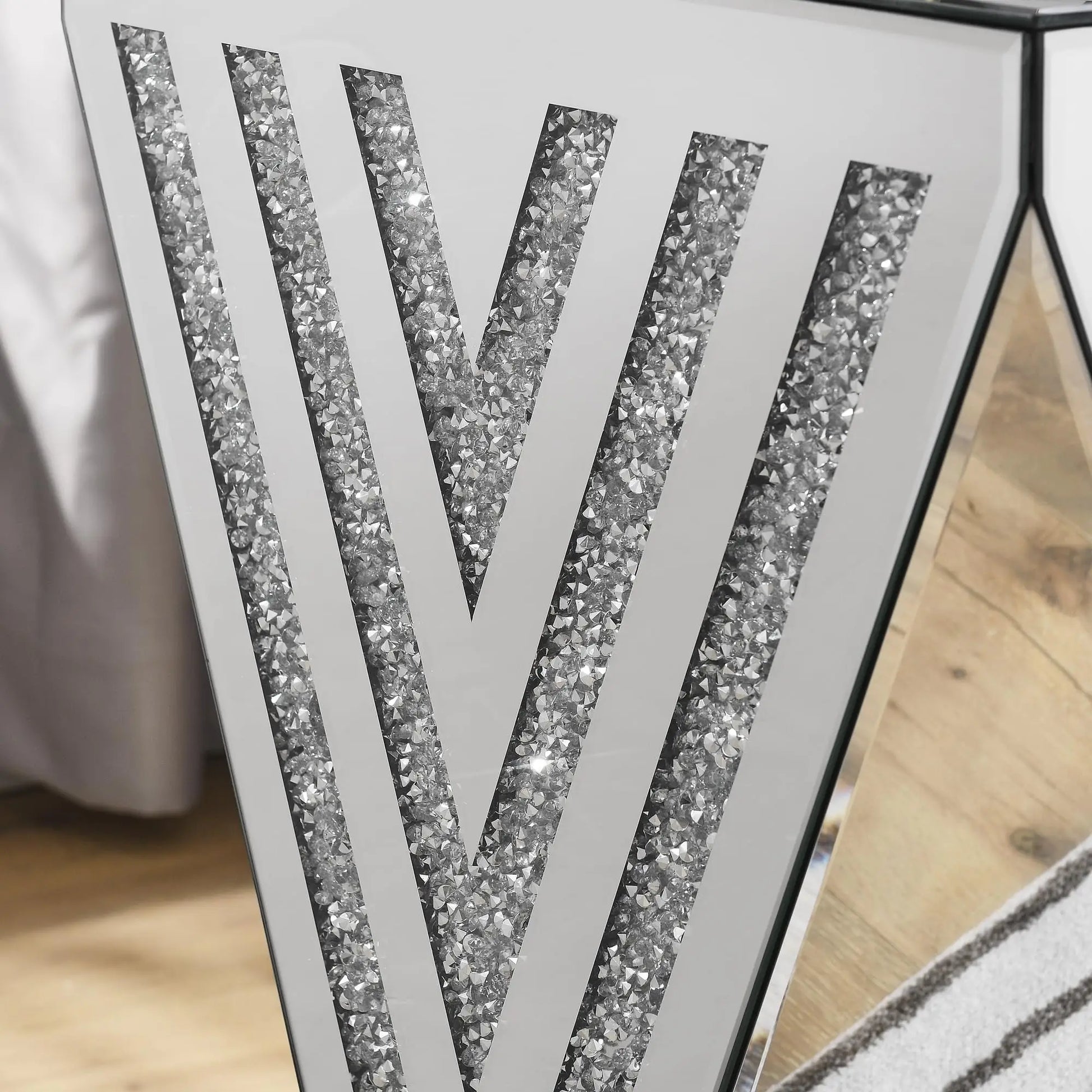 This stunning mirrored end table features a full reflective surface that brightens any room by enhancing natural light. adorned with sparkling diamond-like inlays along the sides, it adds a touch of glamour and elegance to your living room, bedroom, or office.