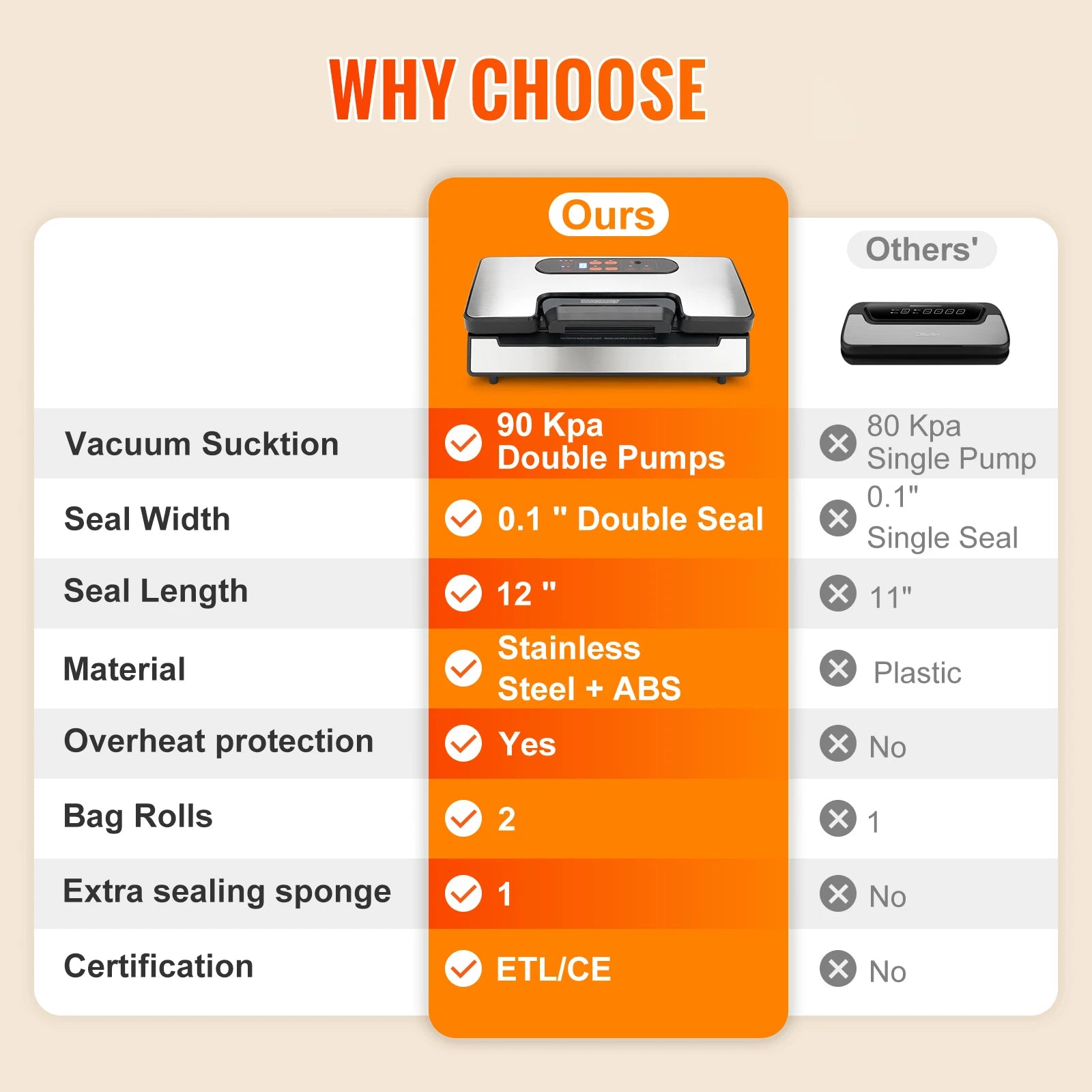 - Two 90Kpa high-suction vacuum pumps and dual sealing strips deliver airtight packaging, keeping food fresher longer, sealing in juices and aromas while significantly reducing waste.